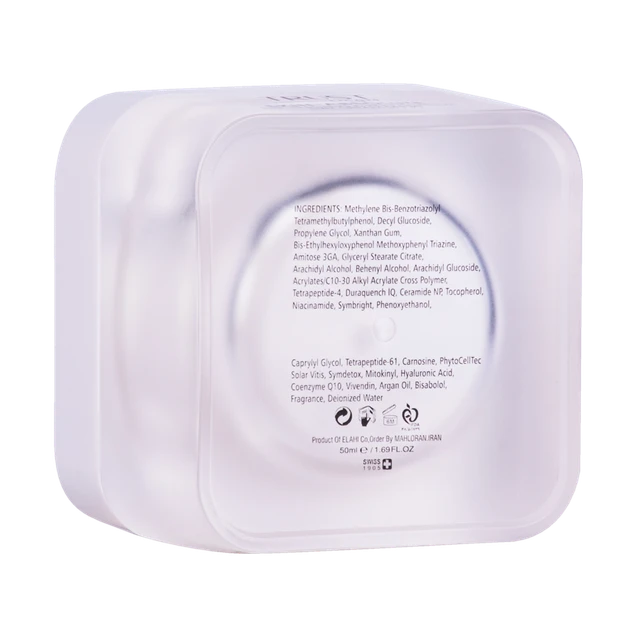 • مهار کننده پرتوهای UV و روشن‌کننده پوست با داشتن ترکیبات فعال آمیتوز 3GA، نیاسین‌آمید، سیم‌برایت، سیم‌دتوکس و میتوکینیل